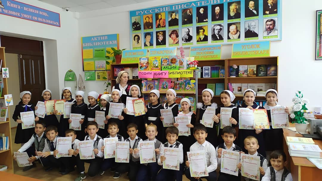 Библиотекарь школы Газуева А.А. провела награждение активных участников акции "Подари книгу библиотеке!"