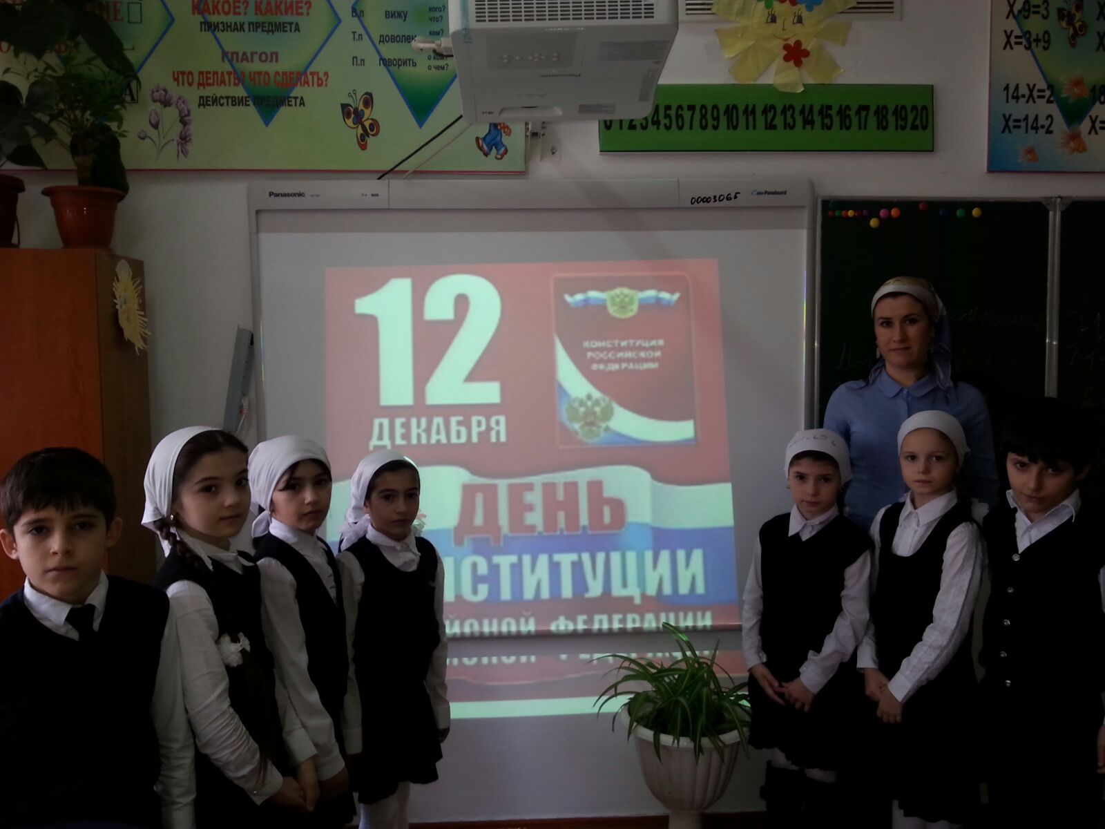 1)Во всех 1 по 11 классы были проведены классные часы: «Права на всякий случай», «Государственные символы», «Я гражданин!», «12 декабря – День Конституции», «Дружбой мы сильны». Классные руководители на классных часах говорили, что 12 декабря – исключительно важный и судьбоносный день в новейшей истории российской государственности. В этот день в 1993 году на всенародном референдуме была принята Конституция Российской Федерации, которая сыграла определяющую роль в развитии всего нашего общества.
