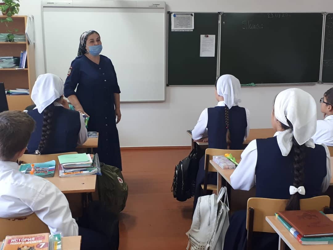 24.09.2020Старший инспектор ПДН ОУУП и ПДН ОМВД России по Шелковскому району, майор полиции Висарагова Зарина Руслановна провела профилактические беседы с обучающимися старших классов МБОУ «Шелковская СОШ √1»
