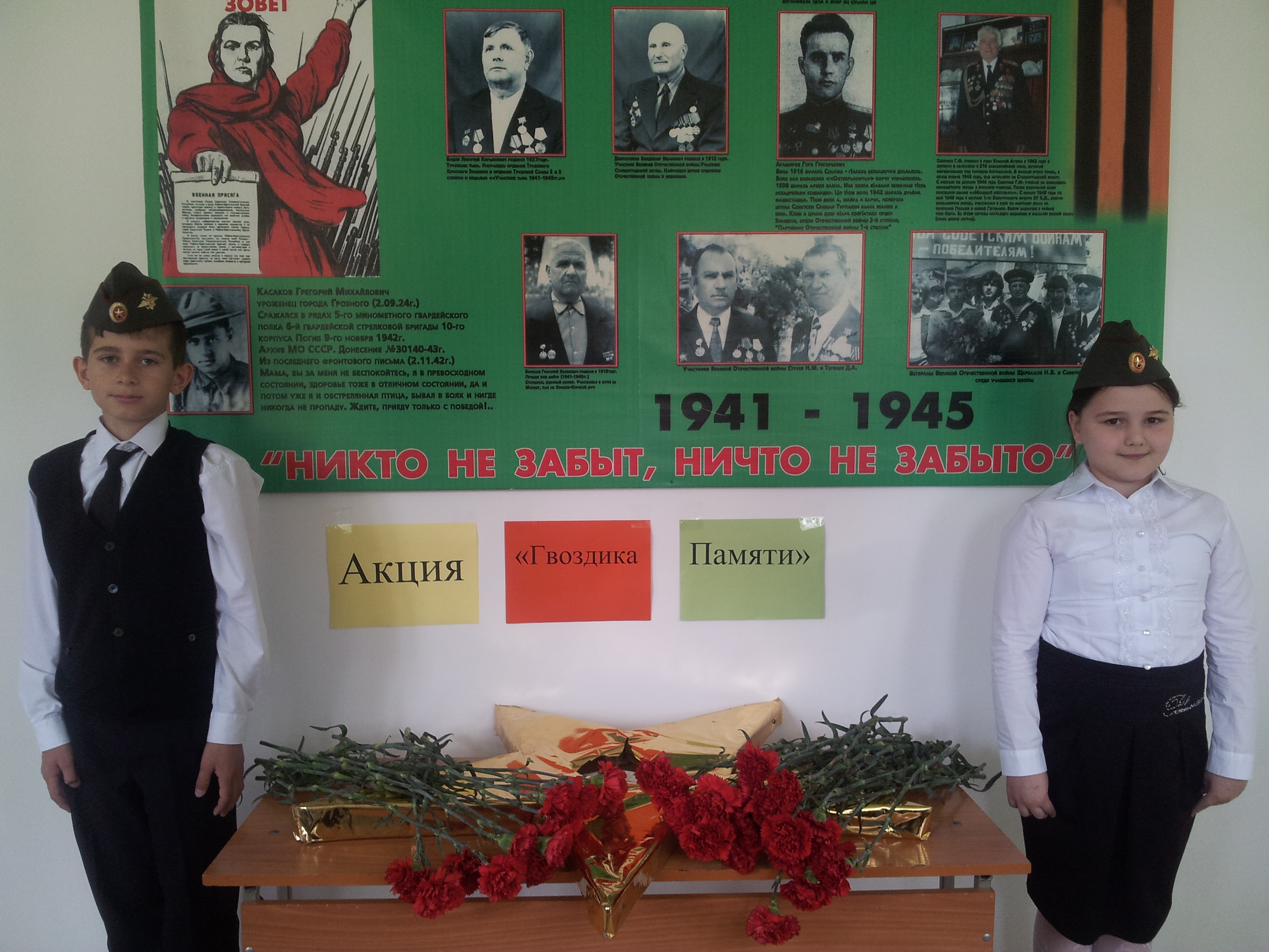 Акция «Гвоздика Памяти» – стартовала с 30 апреля и продлилася по 9 мая 2016г, в количестве 52 обучающихся и 50 педагогов. Обучающимися 10х классов в преддверии акции были розданы «памятки»- листовки с мини объявлением «Завтра – акция «Гвоздика памяти». Будь с нами!»6-7 мая 2016г. в фойе школы была поставлена парта с вазой, куда желающие могли возложить гвоздики в память погибшим. 9мая обучающимися школы и педагогами школы было возложение гвоздик к памятнику Воину Освободителю, атакже 10мая у мемориала первого Президента ЧР, Героя России А.-Х. Кадырова.