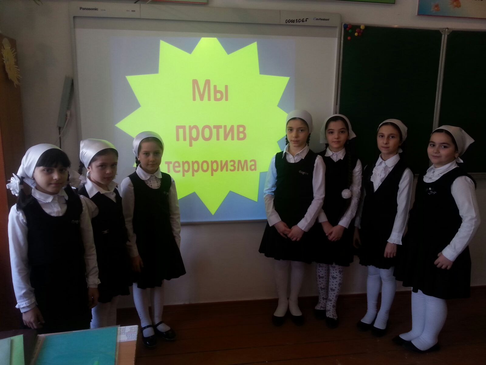1) Были проведены классные часы с 7 – 11 классы: «Дети против террора», «Россия против террора», «Нет террору», «Мы против террора». На классных часах классные руководители говорили, что в России ежегодно 3 сентября отмечается особая дата - День солидарности в борьбе с терроризмом.Это не просто очередной профессиональный праздник, да, и праздником этот день никак не назовешь. Ведь в нашей стране трагическая дата 3 сентября теперь неразрывно связана с ужасающими событиями, произошедшими в Беслане совсем недавно – с 1 по 3 сентября 2004 года.В этот день в нашей стране вспоминают жертв террористических актов, а также сотрудников правоохранительных органов, погибших при выполнении служебного долга.