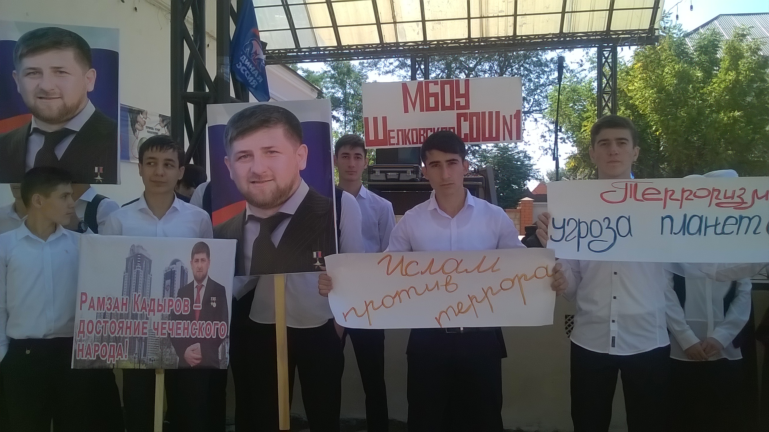 Учителя и обучающиеся на митинге держали в руках флаги России и Чечни, а также транспаранты и плакаты с надписями: «Терроризм угроза планете», «Дети против террора», «Молодежь против террора», «Нет террору», «Ислам против террора». Участники выразили свое негативное отношение к террору.