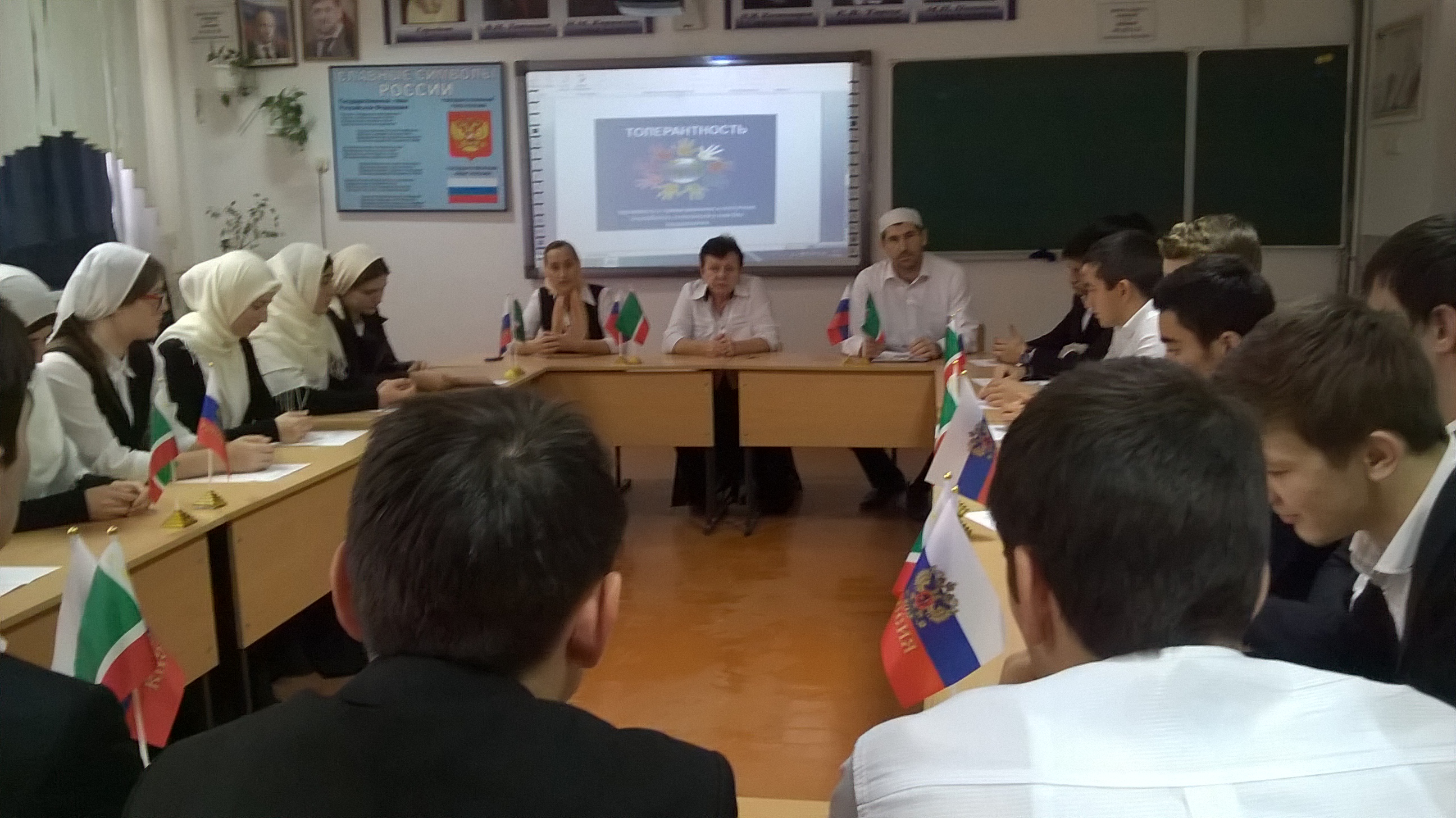 16.11.2016В МБОУ « Шелковская СОШ №1» педагогом по духовно- нравственному воспитанию Джамалдиевым М.Б. , совместно с обучающимися 11 класса был проведен круглый стол « Что такое Толерантность? Её роль и задачи в современном мире