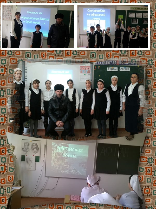 Так же были организованы встречи с участниками Афганской войны Чербиевым Казбеком , Баймуратовым Имраном , которое построено на основе воспоминаний воинов- интернационалистов.Учащиеся подготовили мероприятие,в котором проникновенно читали стихи, c чувством исполняли песни.
