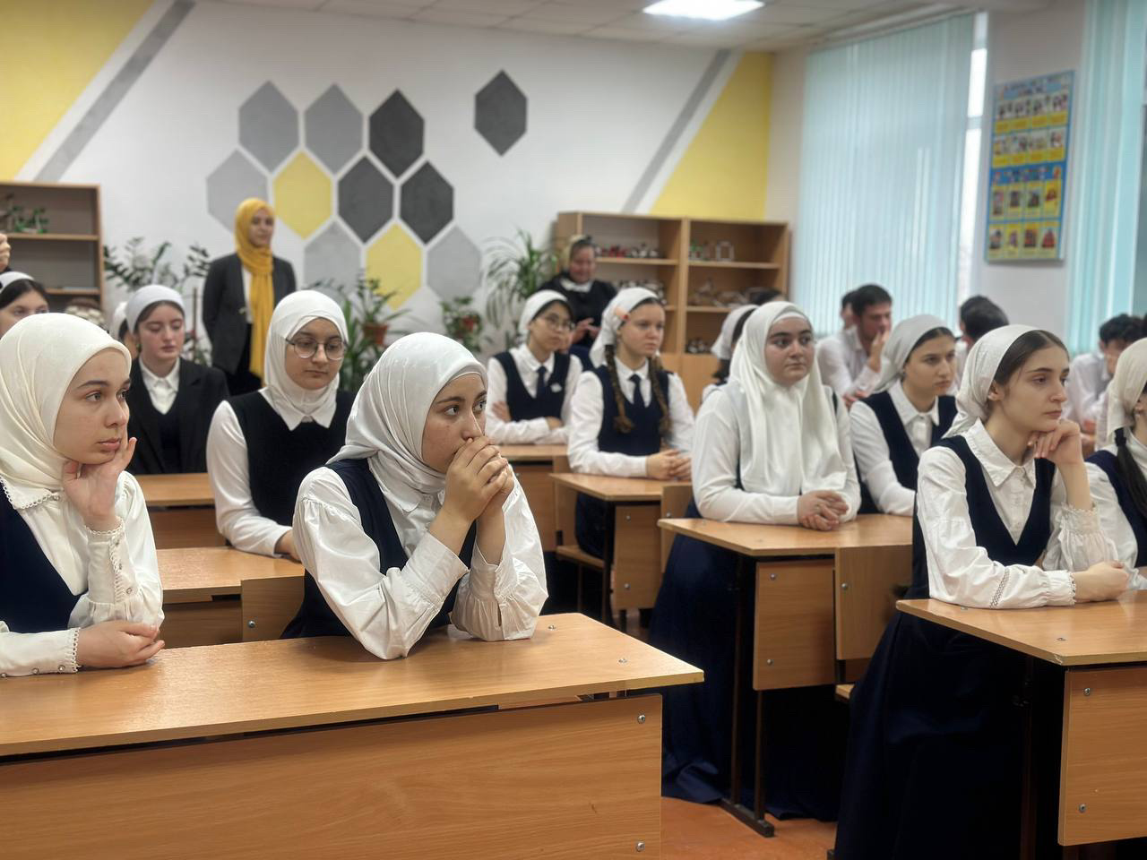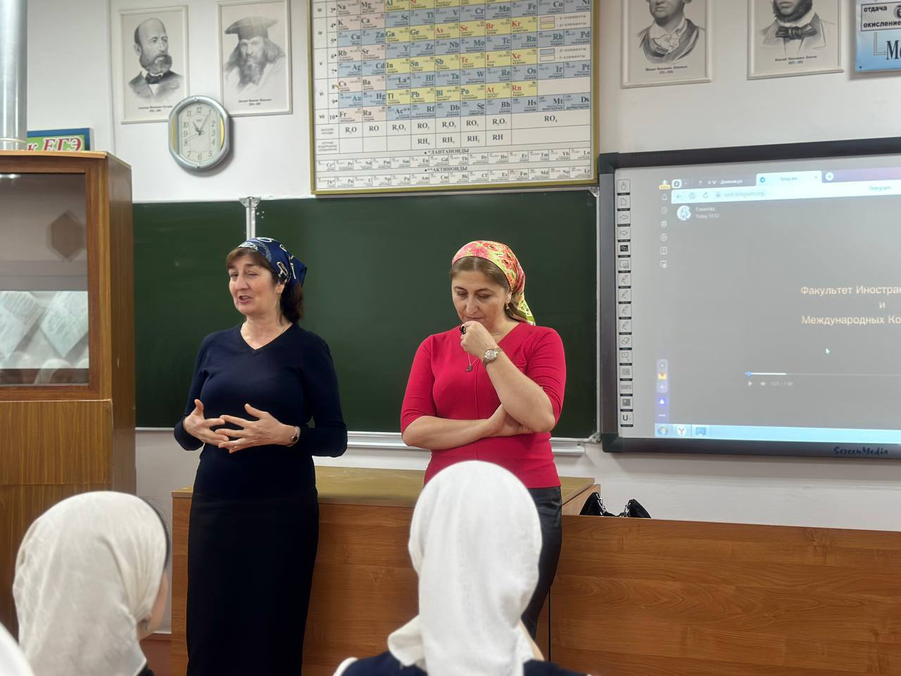 В рамках профориентационной работы зав.кафедрой восточных языков и факультета иностранных языков Рамазанова Р.Т. и зав.кафедрой европейских языков Яхъяева А.А. вместе с студентами факультета иностранных языков и международной коммуникации Чеченского Государственного Педагогического Университета посетили МБОУ «Шелковская СОШ1».
