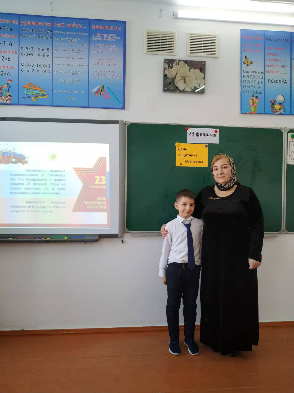 В 3 «А» класс была приглашена мать военнослужащего Бисаева Турко, участника специальной военной операции на Украине, Темирбулатова Киса Ширваниевна.