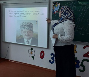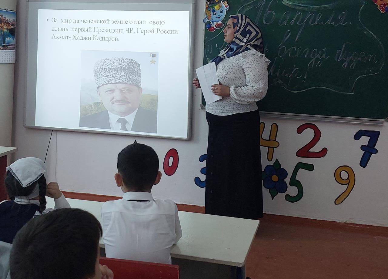 В рамках плана мероприятий, посвященных ко Дню мира в Чеченской Республике (отмены КТО в Чеченской Республике) классным руководителем 1 «Г» класса Косумовой Х. З. был проведен классный час на тему «А.А. Кадыров-Герой нашего времени!».