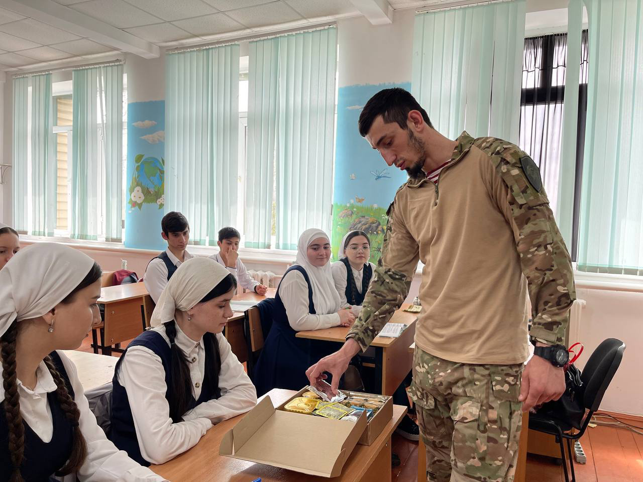 Он рассказал учащимся, как непосредственно участвовал в выполнении специальных задач, в каких условиях. Поговорил о важности и ответственности этой профессии, а также показал и поделился индивидуальным рационом питания для военнослужащих.