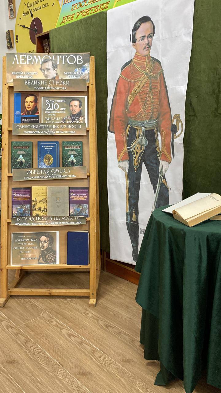 17.10.2024В МБОУ «Шелковская СОШ №1» в нашей школьной библиотеке Газуевой А.А. оформлена книжная выставка к 210-летию Михаила Юрьевича Лермонтова.