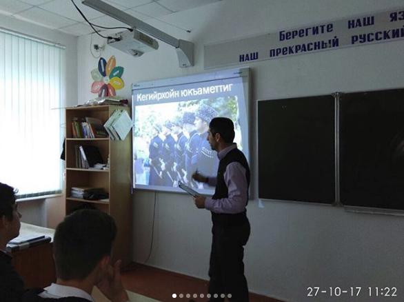 27.10.2017Тахана ишколан 9-чу классийн дешархошца кхетош-кхиоран хьехархочо Бексултанан Мовладис д1адаьхьира "Кегийрхойн юкъаметтиг" ц1е йолу цхьаьнакхетар.