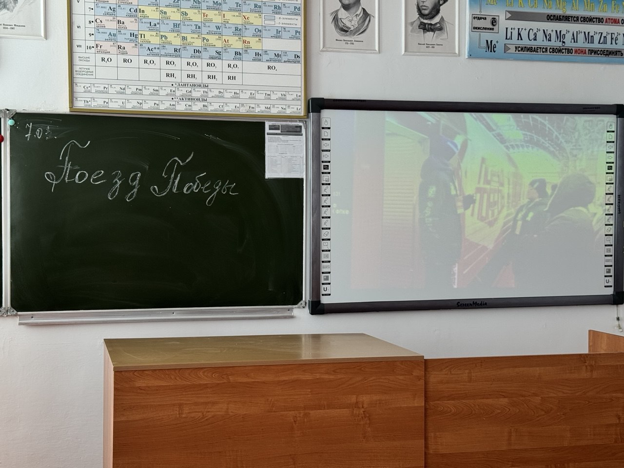 Урок начался с краткого рассказа о проекте "Поезд Победы", его целях и значении в сохранении исторической памяти. Особое внимание было уделено уникальности передвижной экспозиции, воссоздающей ключевые эпизоды Великой Отечественной войны.