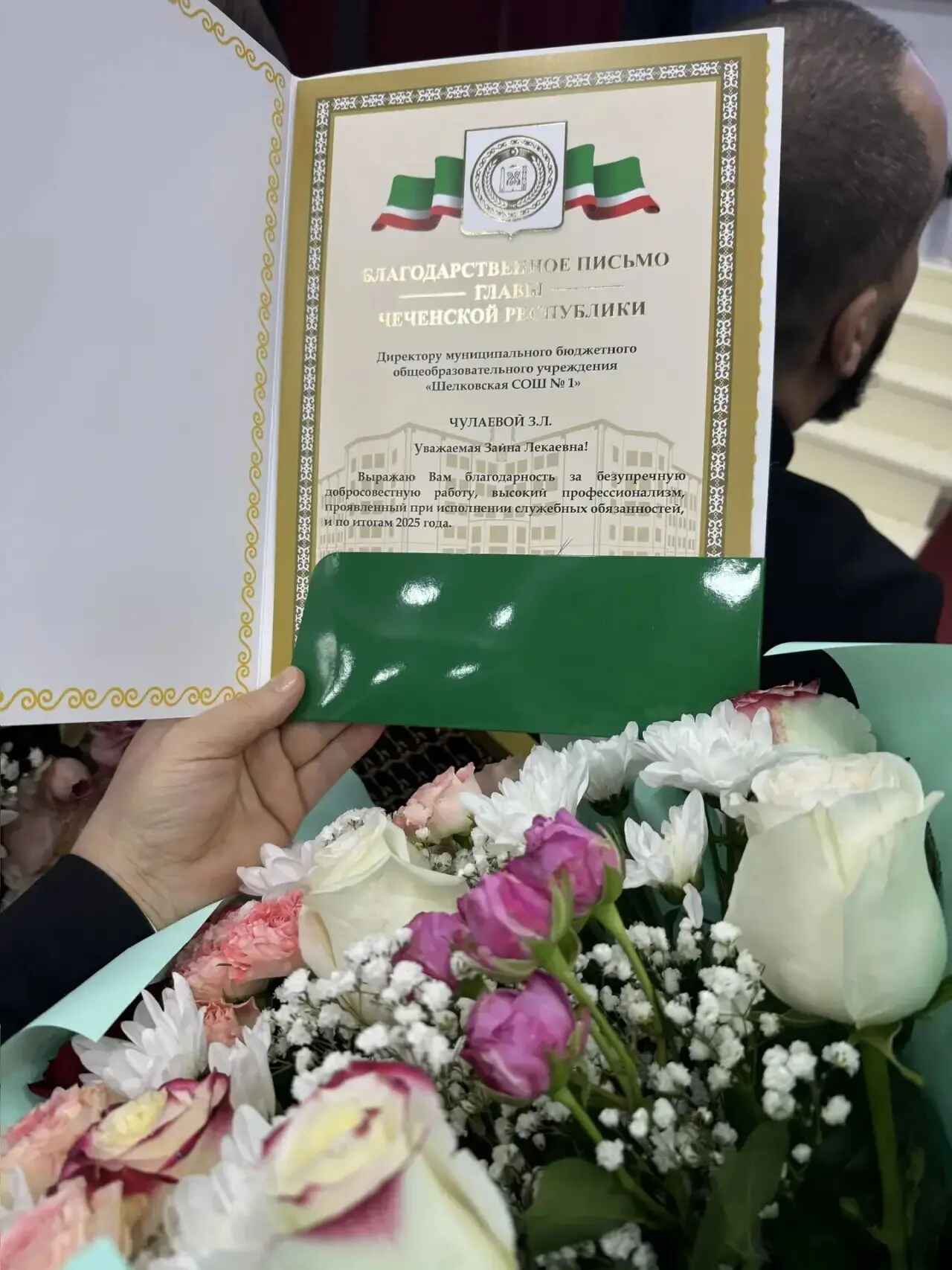 Благодарственное письмо от Главы Чеченской Республики директору нашей школы Чулаевой Зайне Лекаевне