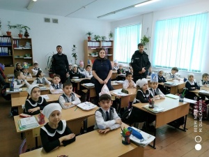 Классный час «Внимание, дорога!» в 1 «г» классе с участием инспекторов ГИБДД и представителей КДН. Классный руководитель: Косумова Х.З.