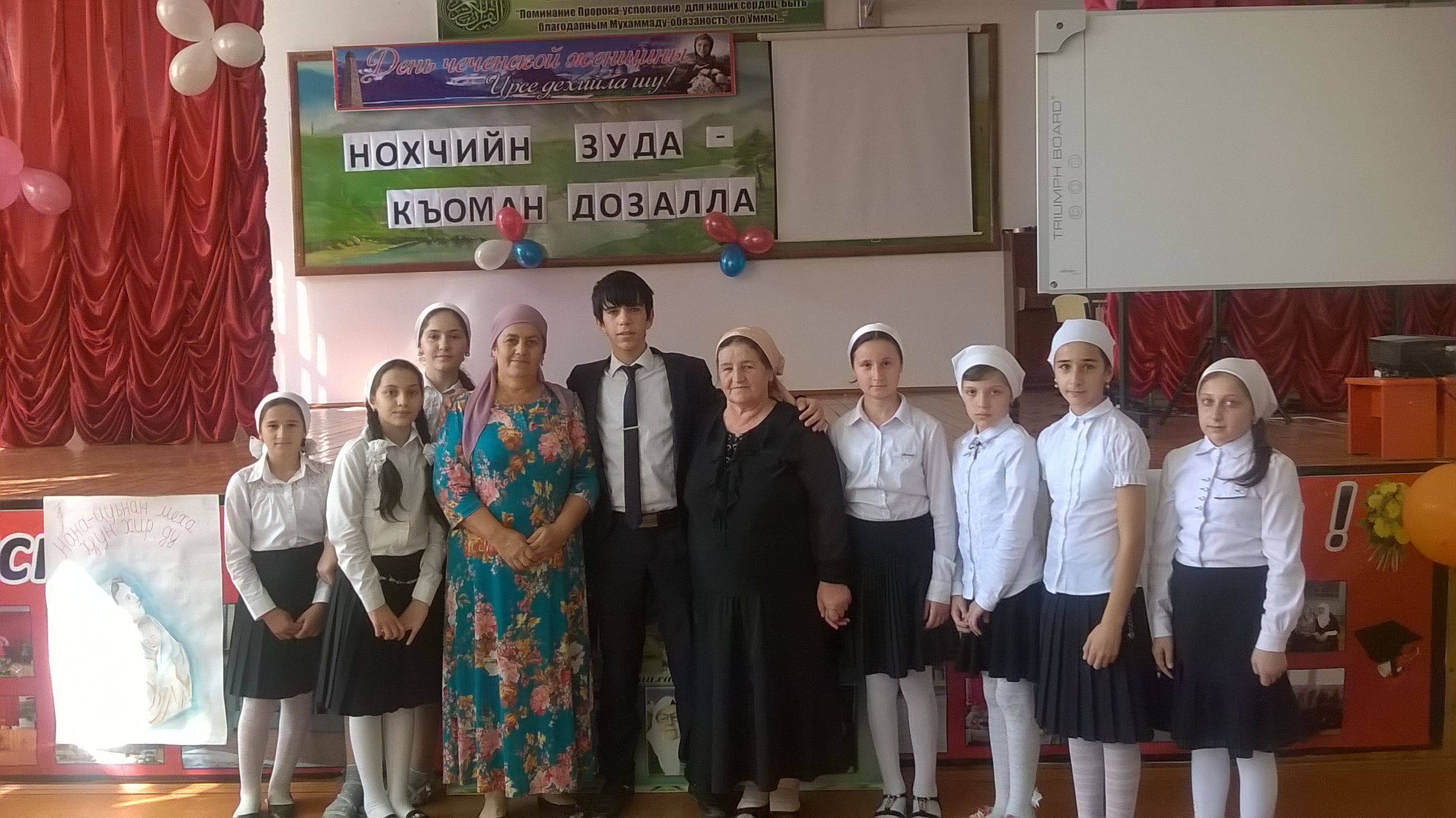 6. 19.09.2015г очень интересно прошло общешкольное мероприятие ««Нохчийн зуда- къоман дозалла». Где обучающиеся4-11 классы поздравили всех женщин присутствующих зале. Ими была подготовлена интересная культурная программа, в ходе которой были исполнены песни, танцы, зачитаны стихи, показаны юмористические сценки, также был проведён конкурс чеченских блюд среди обучающихся 9-11 классов. За призовые места были вручены грамоты. В завершении мероприятия все женщины, присутствующие в зале получили в подарок букеты цветов. Такие мероприятия формируют установку на уважительное отношение к своим корням, воспитывают уважительное отношение к обычаям и традициям чеченского народа, воспитывают патриотизм, чувство ответственности за свою республику, страну.