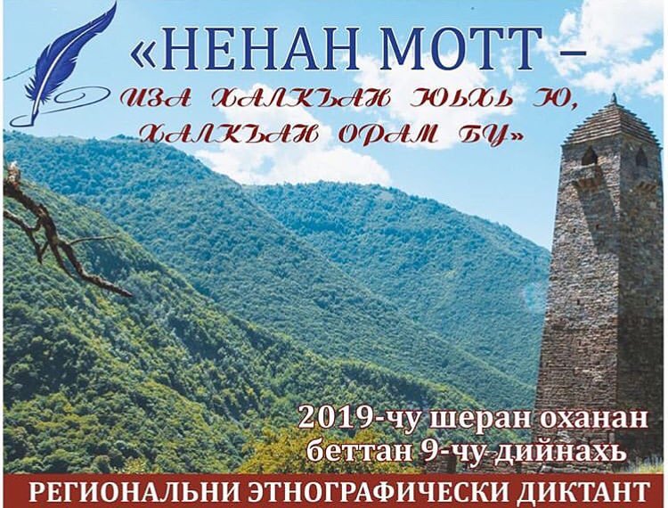 ИЗА, НОХЧИЙН МАТТЕ БОЛУ БЕЗАМ Ч1АГ1БАН, ЦУЬНАН ВАЙН ДАХАРЕХЬ ЛЕЛАР СОВДАККХА, РЕСПУБЛИКИН БАХАРХОЙН НЕНАН МАТТАХ ДОЛУ ХААРШ АЛСАМДАХА ЙОЛЧУ 1АЛАШОНЦА ЕШ Ю. "НЕНАН МОТТ – ИЗА ХАЛКЪАН ЮЬХЬ Ю, ХАЛКЪАН ОРАМ БУ" Ц1Е ЙОЛУ ЭТНОГРАФИЧЕСКИ ДИКТАНТ 2019-ЧУ ШЕРАН ОХАНАН БЕТТАН 9-ЧУ ДИЙНАХЬ ХИР Ю. ДИКТАНТ ЯЗЪЕН МЕТТИГАШ НОХЧИЙН РЕСПУБЛИКИН МАССО А ДЕШАРАН ОРГАНИЗАЦИШ Ю. ДИКТАНТАН Т1ЕДАХКАРШ ТЕСТИЙН КЕПЕХЬ ДОЛЧУ 50 ХАТТАРХ ЛАЬТТА. ИЗА Д1АХЬОШ А, ЦУЬНАН ЖАМ1АШ ДЕШ А ВОВШАХТОХАРАН КОМИТЕТО БОЛХ БИЙР БУ. ЭТНОГРАФИЧЕСКИ ДИКТАНТАХ ЛАЬЦНА ЮЬЗЗИНА ЙОЛУ ИНФОРМАЦИ МИНИСТЕРСТВОН САЙТ Т1ЕХЬ Ю.