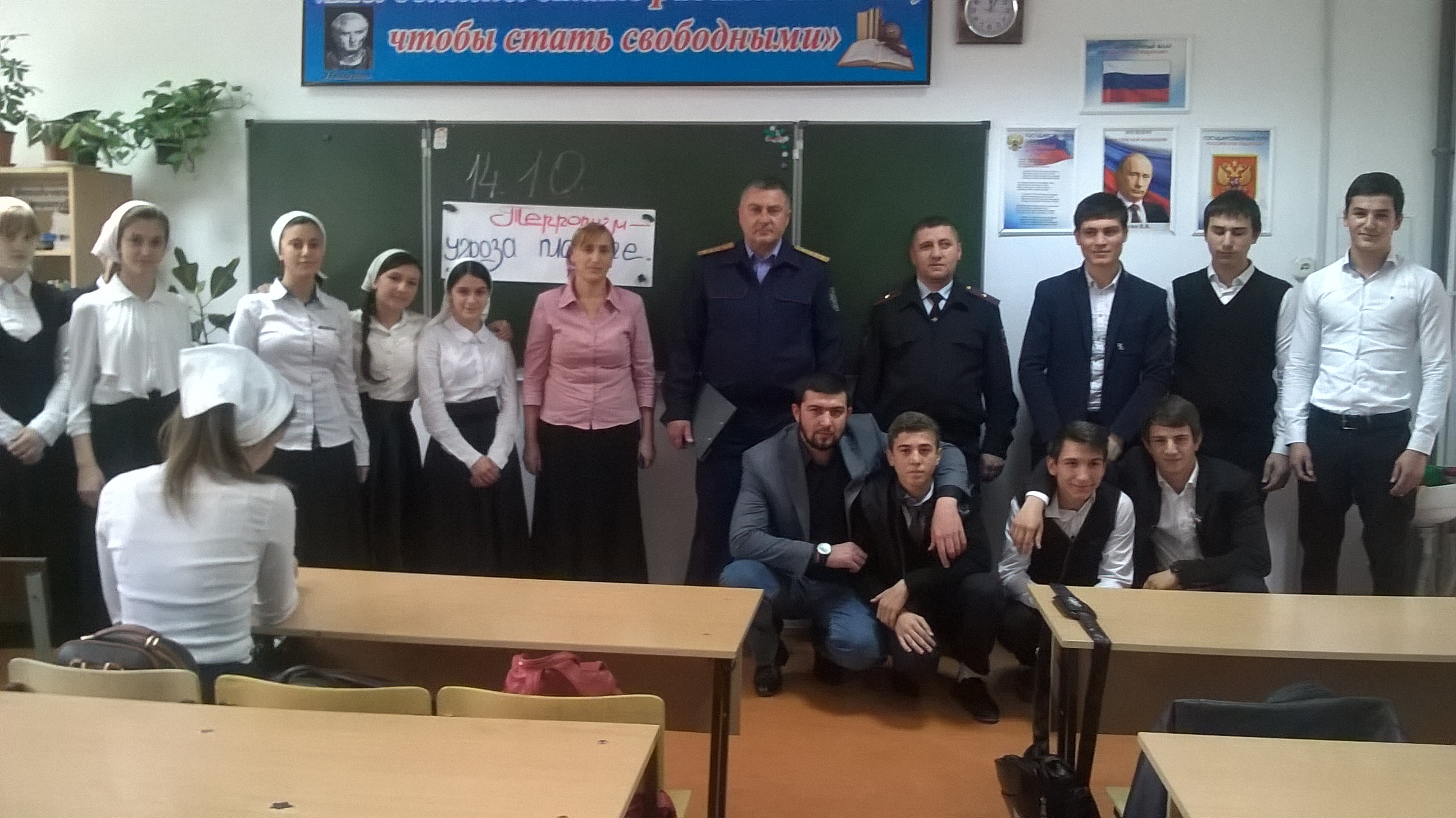 14.10.201514.10. 2015 г. в школе проведена совместное мероприятие с представителями ст. ОУ ОЧР ОМВД по России по Шелковскому району ГазиевымАлиханомАбдулаевичом; И.О. Руководителя СО по Шелковскомурайону СУ СК РФ по ЧР Шенкао Муратом Бойковичом на тему: «Терроризм – угроза обществу» где приняли участие обучающиеся 8-11 классов. Они свою беседу начали с опроса учащихся: «Что они знают о терроризме?». Далее они сами дали полное и развернутое определение терроризму. Терроризм и экстремизм - это исключительно большая опасность, способная расшатать любое, даже самое стабильное и благополучное, общество.